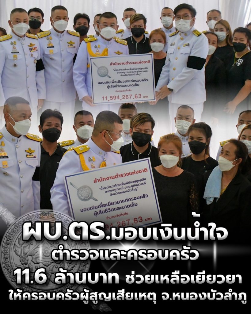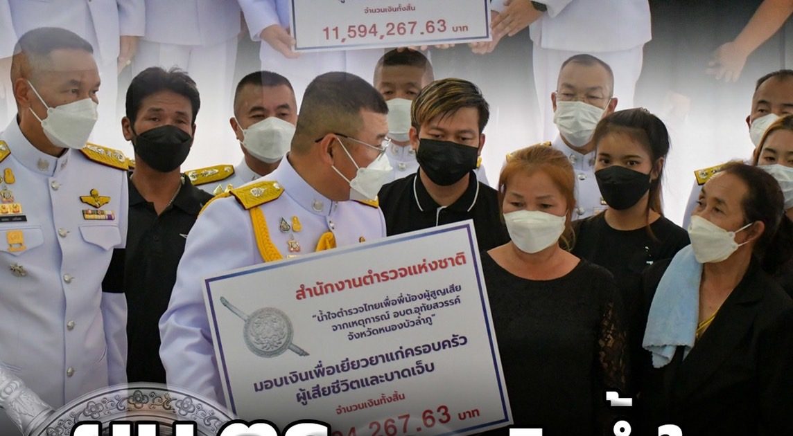 วันนี้ได้แจ้งยอดเงินให้กับครอบครัวผู้เสียชีวิตและบาดเจ็บทราบในเบื้องต้น โดยครอบครัวผู้เสียชีวิตจะได้รับ รายละ 290,000 บาท ผู้บาดเจ็บสาหัส รายละ 230,000 ส่วนผู้บาดเจ็บเจ็บไม่สาหัส รายละ 115,000 โดยจะทำการมอบจริงในวันที่ 18 ต.ค.65 ซึ่งจะมีผู้บังคับการตำรวจภูธรจังหวัดหนองบัวลำภู และ รองผู้บังคับการฯ เป็นตัวแทนมอบ คาดว่าจะมีเงินบริจาคมากถึงกว่า 12 ล้าบาท ทั้งนี้เพื่อเป็นขวัญและกำลังใจ และอยากให้รู้ว่ายังมีคนอีกมากที่คอยให้กำลังใจอยู่ ต้องขอขอบคุณในน้ำใจของทุกท่านที่ร่วมกันบริจาค “
