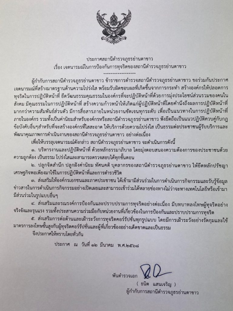 เมื่อวันที่ 12 มี.ค. 2568 เวลา 09.20 น. พ.ต.อ.ธนิต แสนเจริญ ผกก.สภ.ย่านตาขาว ,พ.ต.ท.พนมรุ้ง ขอนพุดซา รอง ผกก.ป.ฯ , พ.ต.ท.เจษฏา แสงมณี รอง ผกก.สส.ฯ , พ.ต.ท.ปฐมพร ปราบปัญจะ รอง ผกก.(สอบสวน)ฯ พร้อมด้วยข้าราชการตำรวจในสังกัด ร่วมประกาศเจตนารมณ์การป้องกันและต่อต้านการทุจริต