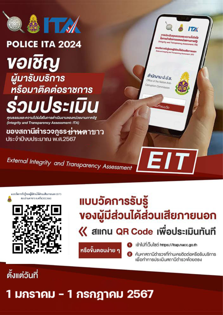 | สถานีตำรวจภูธรย่านตาขาว จังหวัดตรัง ขอเชิญชวน ผู้มารับบริการ / มาติดต่อ สถานีตำรวจ ร่วมประเมินแบบวัดการรับรู้ของผู้มีส่วนได้ส่วนเสียภายนอก (External Integrity and Transparency Assessment: EIT)สำหรับนำไปพัฒนาปรับปรุงการให้บริการของสถานีตำรวจ ประจำปีงบประมาณ 2567 |