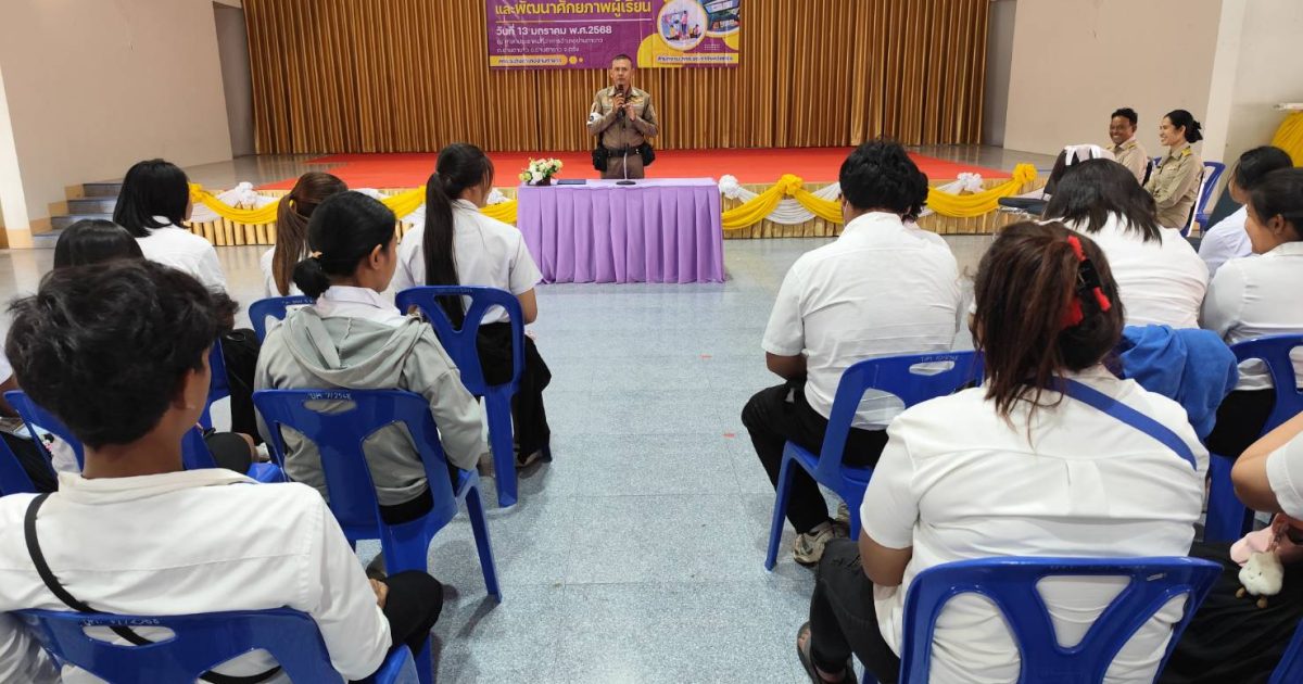 วันที่ 13 ม.ค.68 เวลา 10.00 น. พ.ต.อ.ภาสกร ภักดีวานิช รอง ผบก.ภ.จว.ตรัง รรท.ผกก.สภ.ย่านตาขาว, มอบหมาย พ.ต.ท.นรินทร์ ช่วยสุข รอง ผกก.ป. , สภ.ย่านตาขาว พ.ต.ท.ถาวร สังขมัน สว.อก.ฯ และ เจ้าหน้าที่ตำรวจจราจร ร่วมกับผู้อำนวยการสถานศึกษาศูนย์ส่งเสริมการเรียนรู้ระดับอำเภอย่านตาขาว ดำเนินการให้ความรู้เรื่องยาเสพติดและอบายมุขในสถานศึกษาแก่นักศึกษา ตามโครงการ “ส่งเสริมและพัฒนาศักยภาพผู้เรียนฯ ” ณ ศาลาประชาคมอำเภอย่านตาขาว