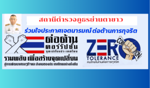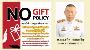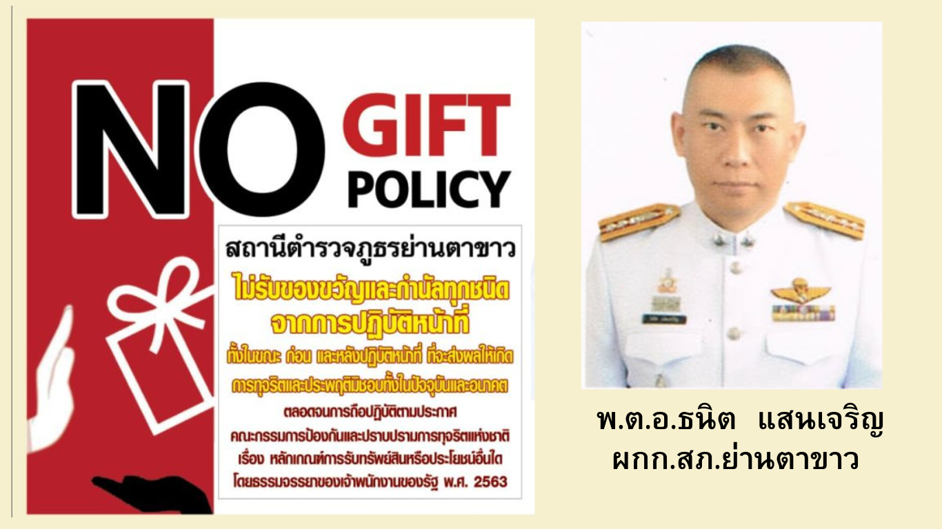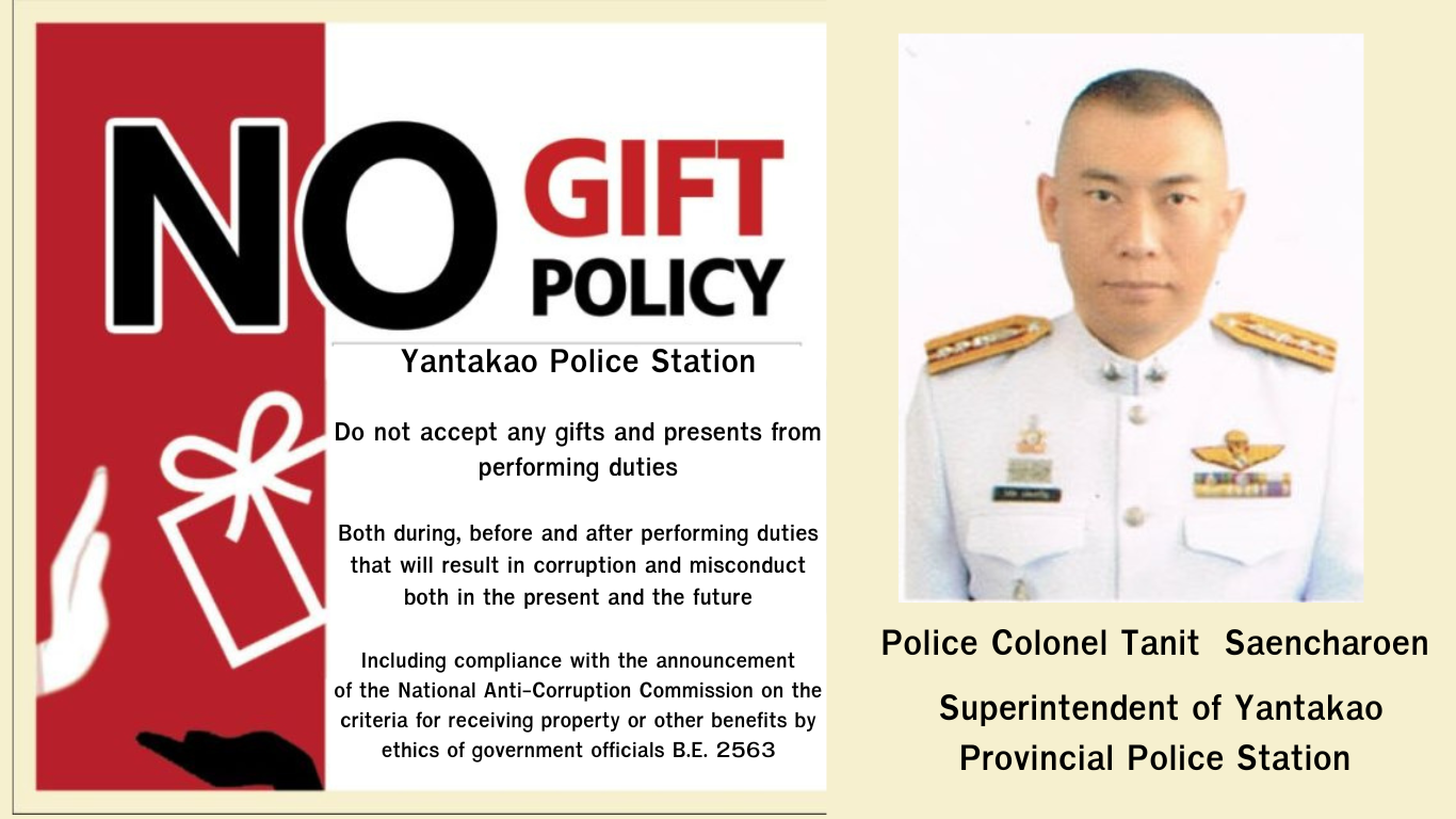 ติดไว้ในจุด บริการของสถานี เพื่อให้ประชาชนทราบว่า หน่วยงานประกาศว่าเจ้าหน้าที่ทุกคนในสังกัดไม่รับของขวัญหรือของกำนัลจากการปฏิบัติหน้าที่ และต่อต้านการรับสินบน โดย มี พ.ต.อ.ธนิต แสนเจริญ ผกก.สภ.ย่านตาขาว หัวหน้าหน่วยงานประกาศ